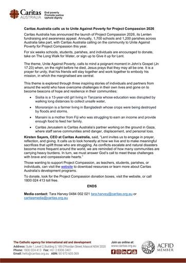 7. 250217 – Caritas Australia – Caritas Australia calls us to Unite Against Poverty for Project Compassion 2026