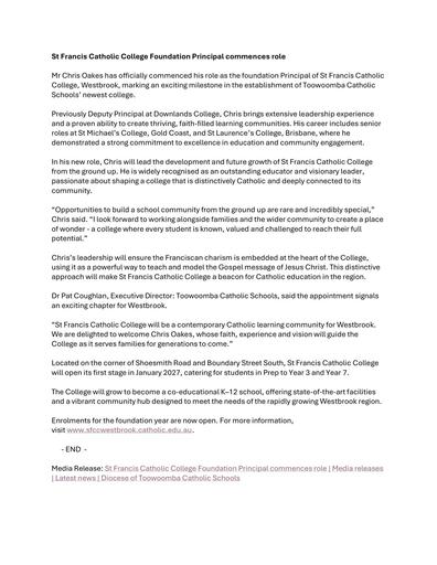 260113 – Diocese of Toowoomba Catholic Schools Office -St Francis Catholic College Foundation Principal commences role.pdf