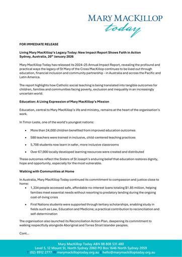 260127 – Mary Mackillop Today – Living Mary MacKillop’s Legacy Today- New Impact Report Shows Faith in Action Sydney, Australia, 20th January 2026.pdf