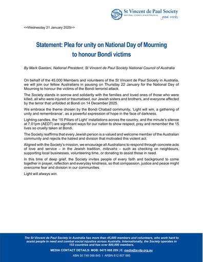 7. 260120 – St Vincent de Paul Society Australia – Plea for unity on National Day of Mourning to honour Bondi victims