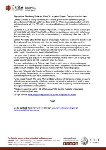 7. 260120 – Caritas Australia – Sign up for ‘The Long Walk for Water’ to support Project Compassion this Lent