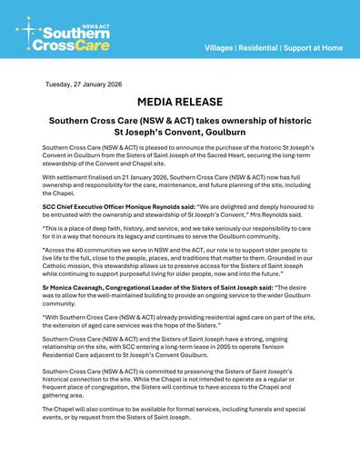 pdf 260127 – Southern Cross Care NSW/ACT – Southern Cross Care NSW and ACT takes ownership of historic St Joseph’s Convent Goulburn