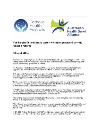7. 260113 – CHA – Not-for-profit healthcare sector welcomes proposed private funding reform