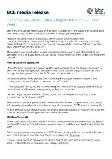 260414 – Brisbane Catholic Education – Star of the Sea School building a brighter future this BCE Open Week!.pdf